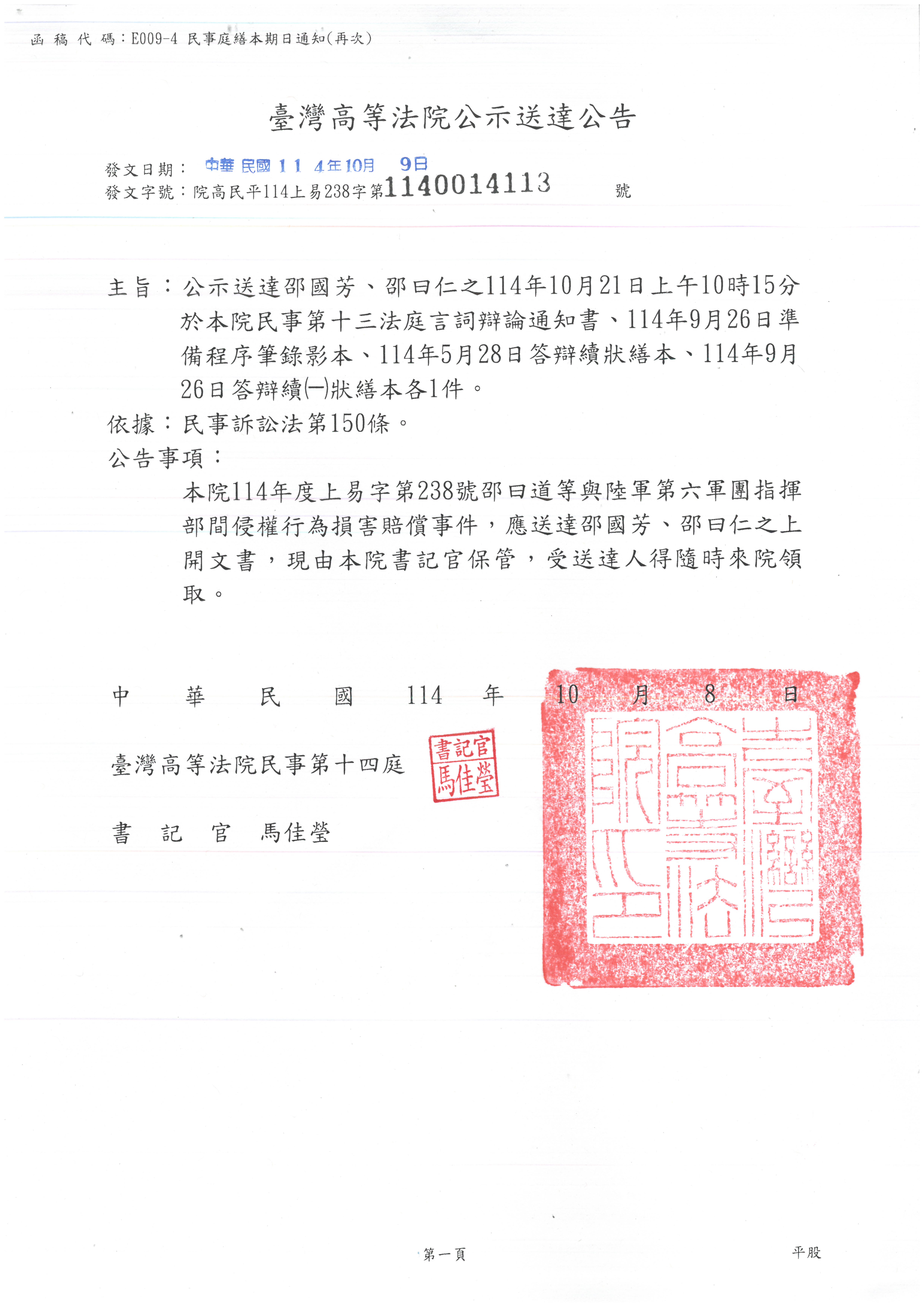國外民事公示送達臺灣高等法院114年度上易字第000238號邵國芳、邵曰仁之開庭通知書1件、筆錄影本1件、書狀繕本2件