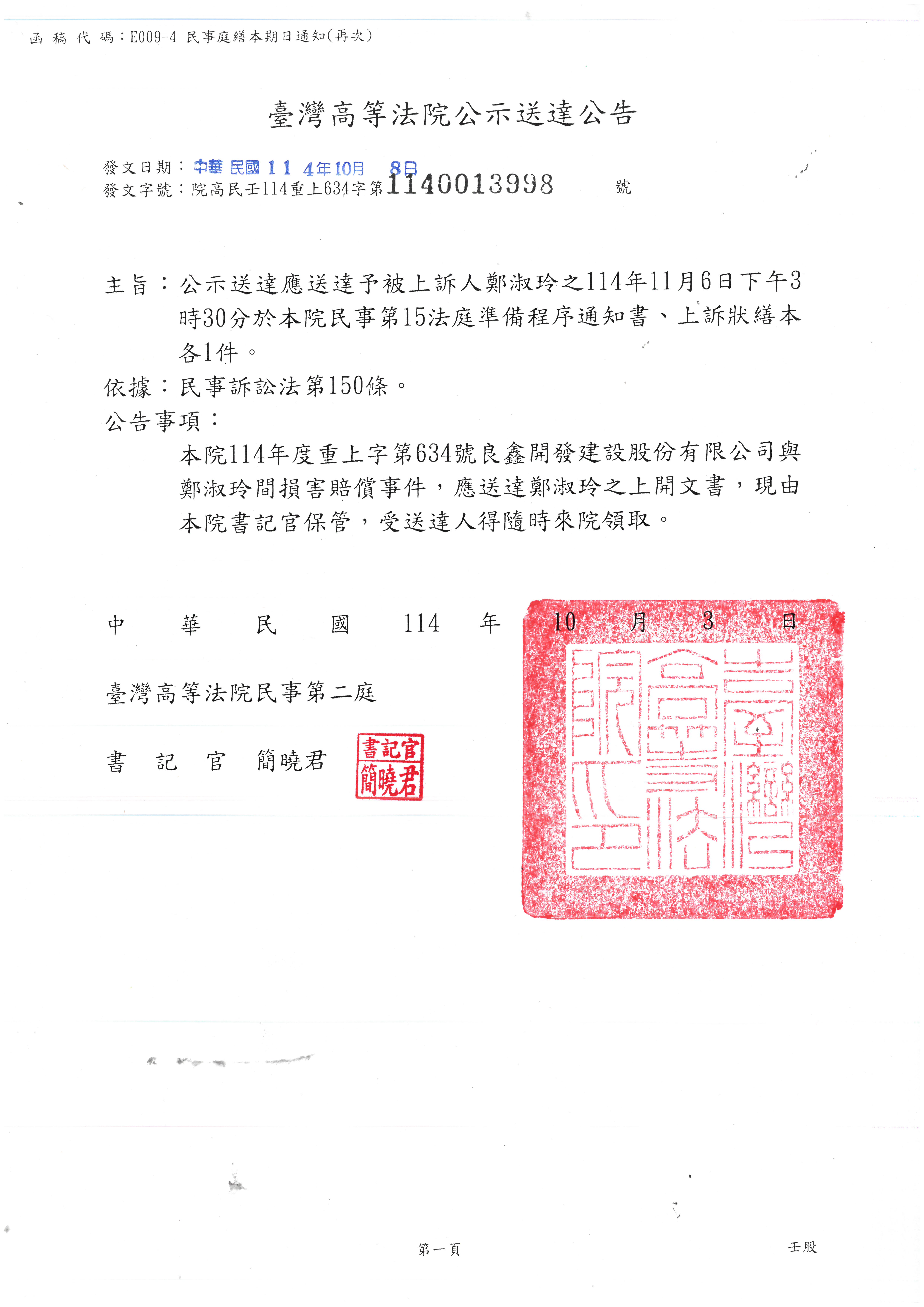 國外民事公示送達臺灣高等法院114年度重上字第000634號鄭淑玲之開庭通知書1件、書狀繕本1件