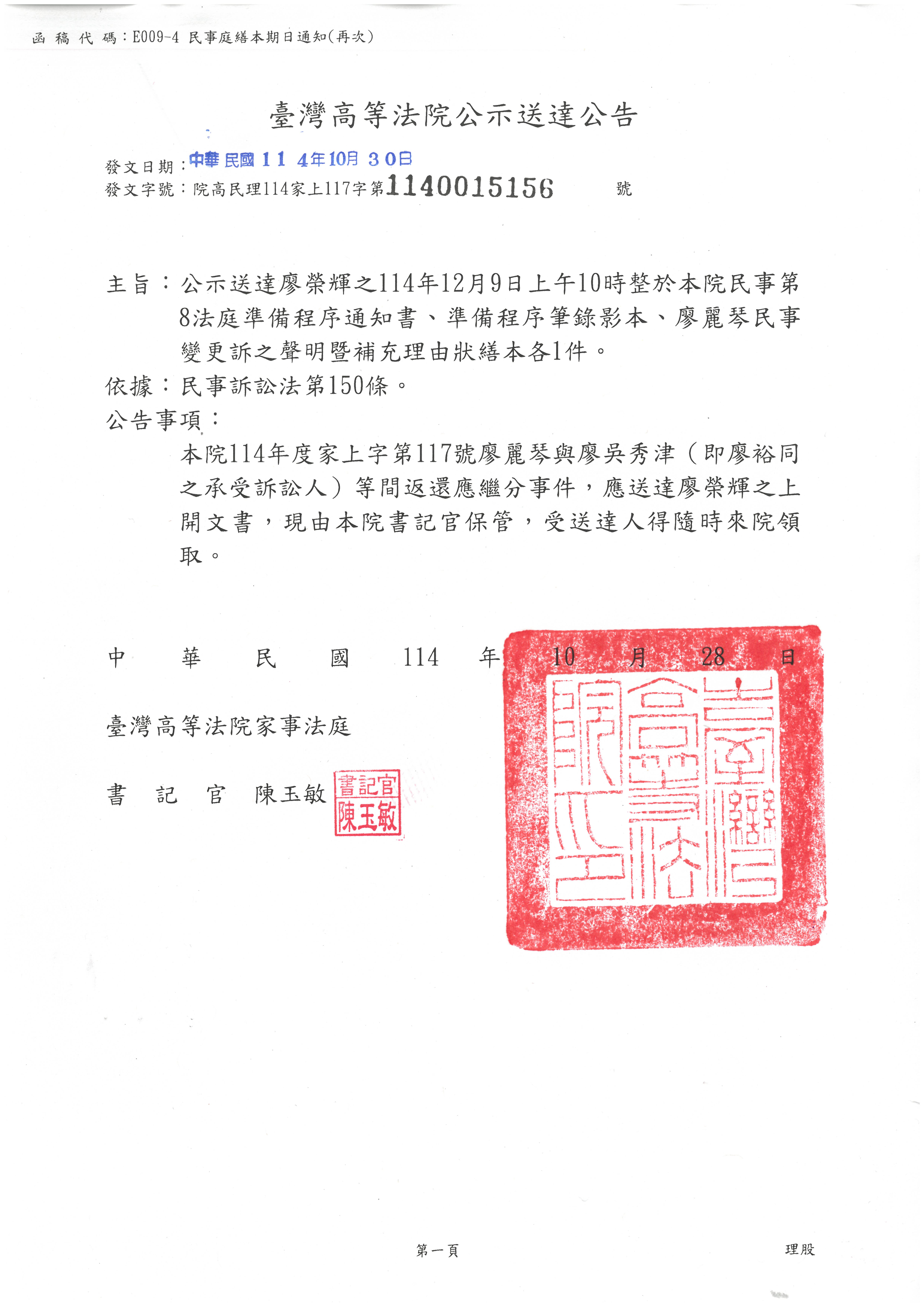 114年度家上字第117號廖榮輝114年10月30日公示送達
