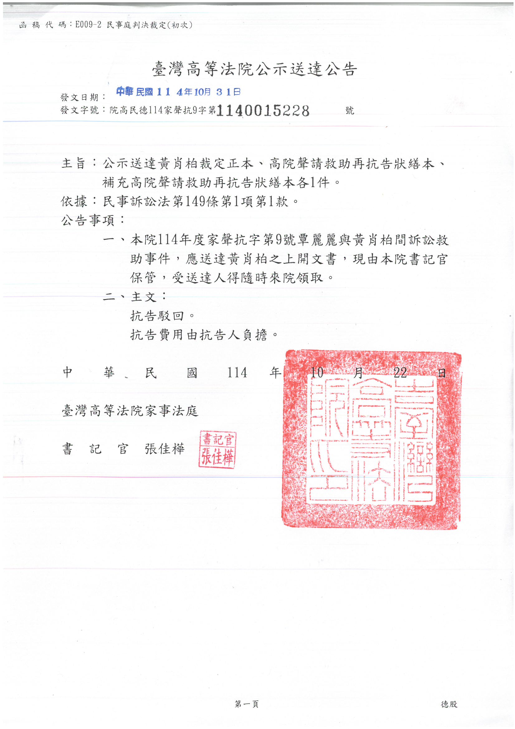 國內、國外民事公示送達臺灣高等法院114年度家聲抗字第000009號黃肖柏之裁定1件、書狀繕本2件