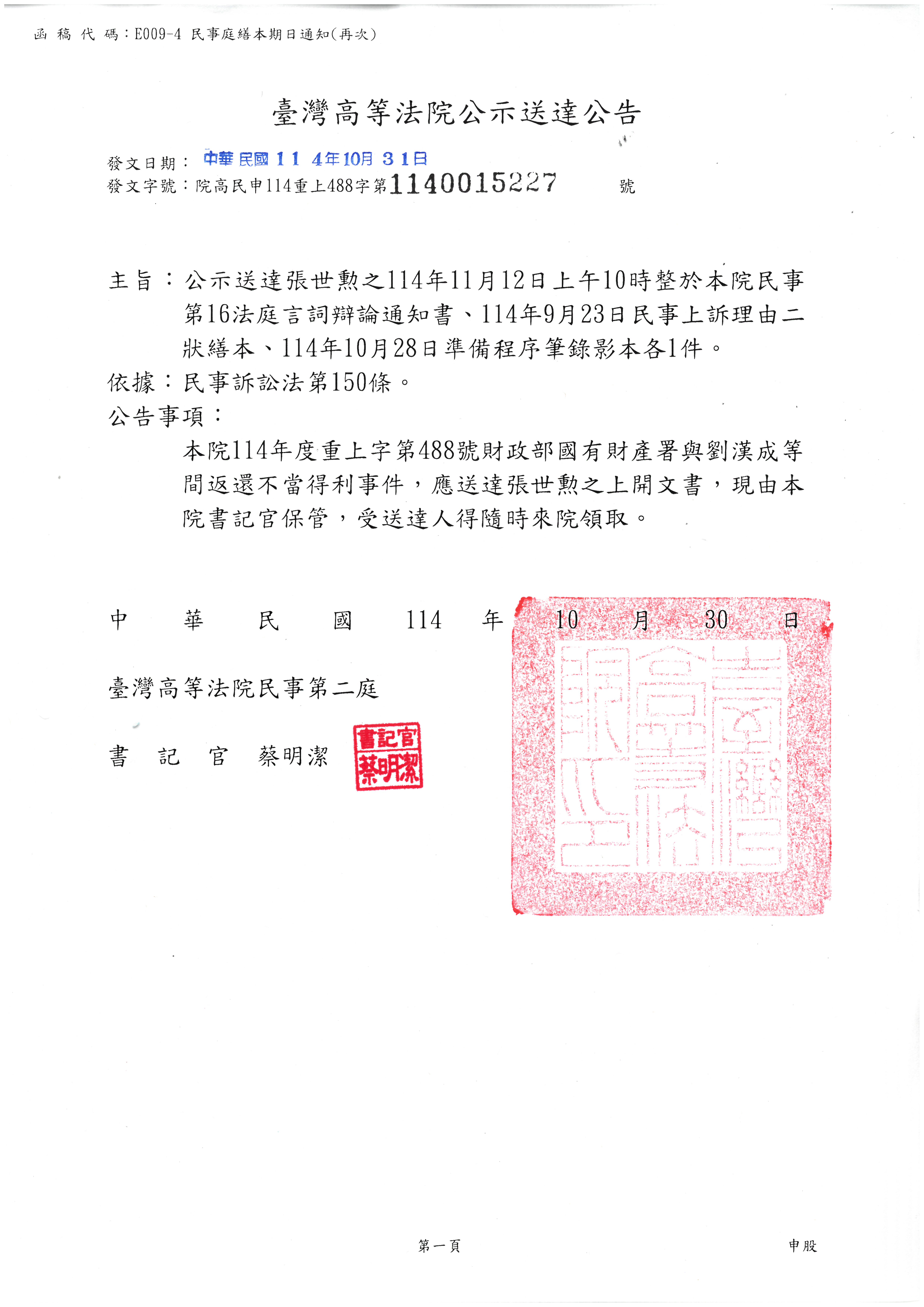 國外民事公示送達臺灣高等法院114年度重上字第000488號張世勲之開庭通知書1件、書狀繕本1件、筆錄影本1件