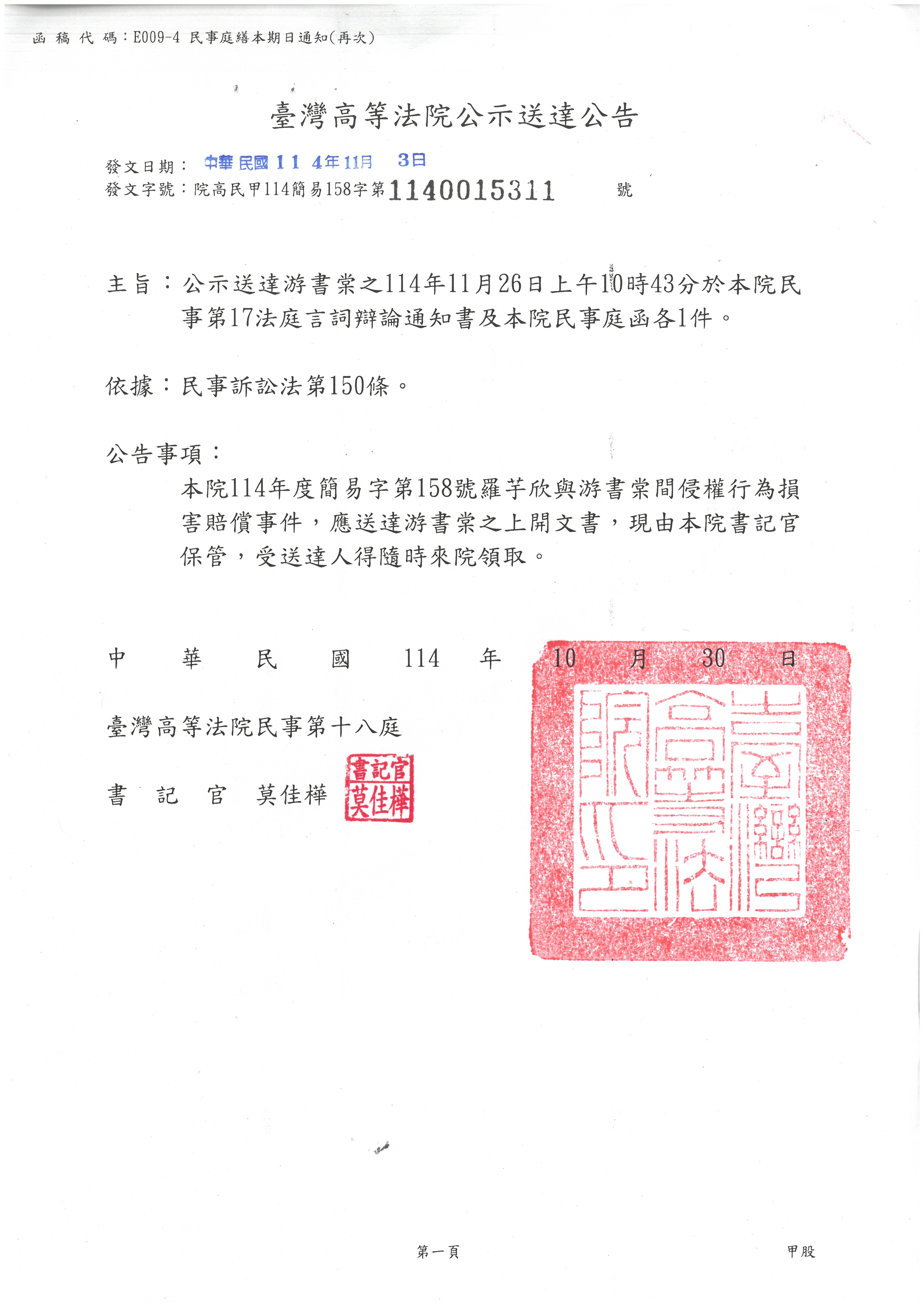 國內、國外民事公示送達臺灣高等法院114年度簡易字第000158號游書棠之開庭通知書1件、民事庭函1件